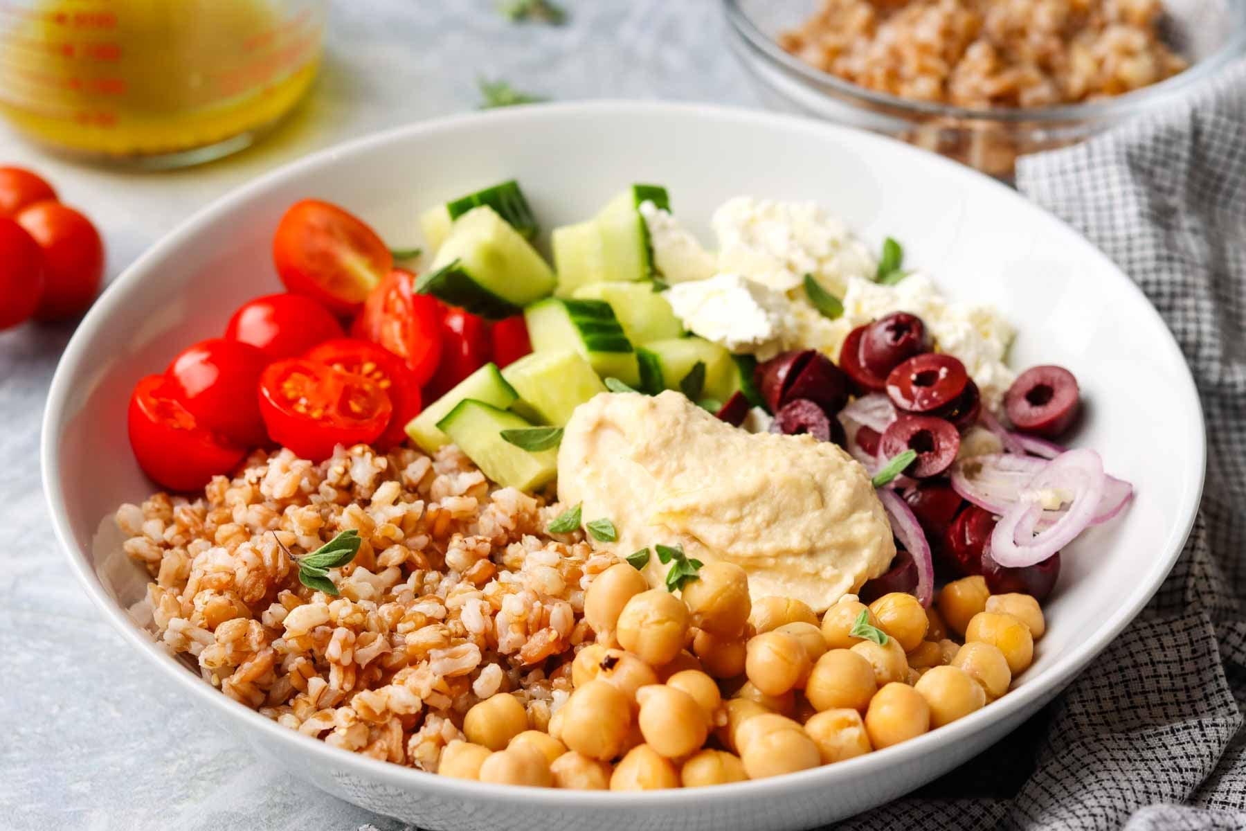 - Divide the cooked farro among 4 bowls, then add the chickpeas, tomatoes, cucumber, olives, feta, shallots, and oregano on top.